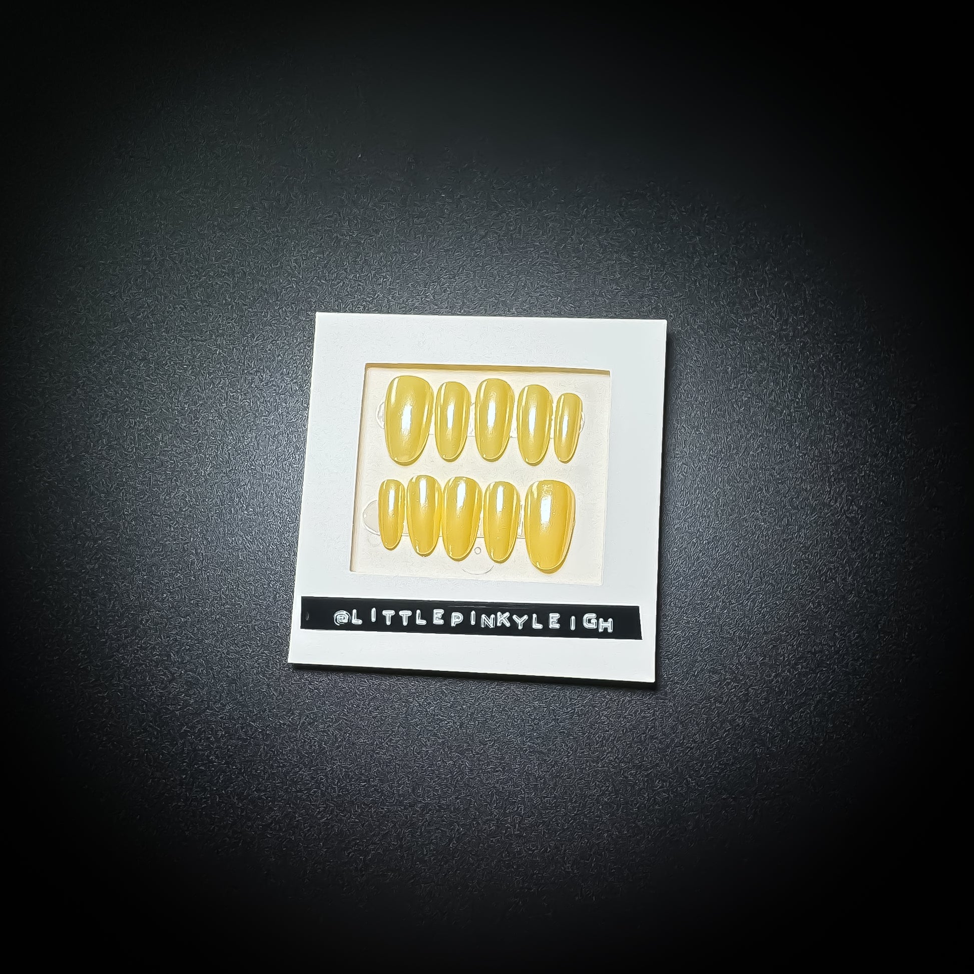 Creamy Butter Chrome is sweet and smooth. This set of press-on nails adds a pop of color without being too loud. The nails shown here are Round shape in Medium length.